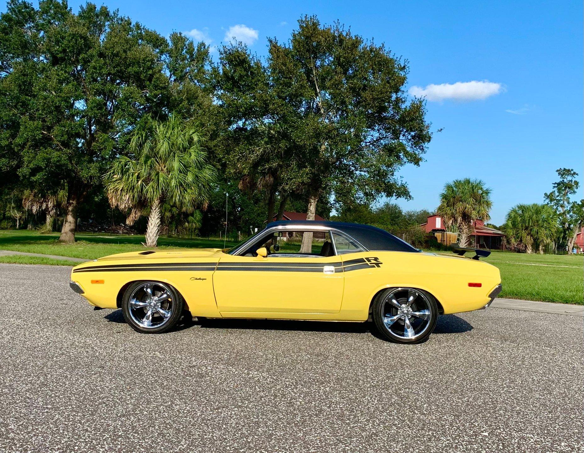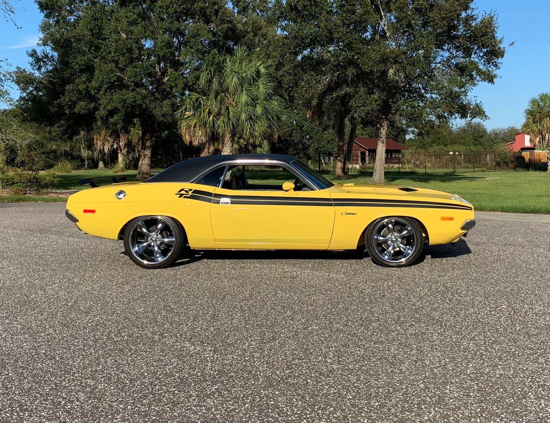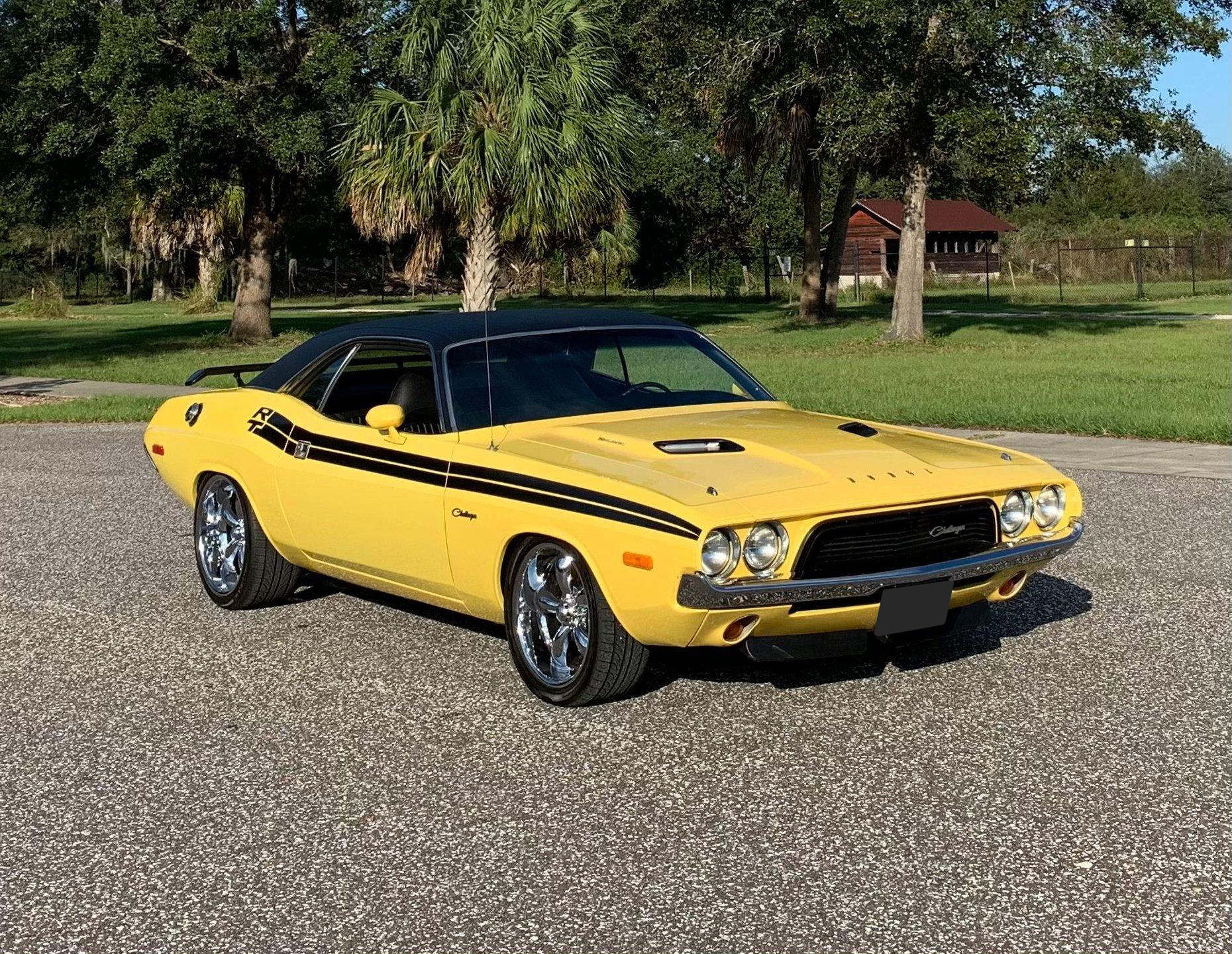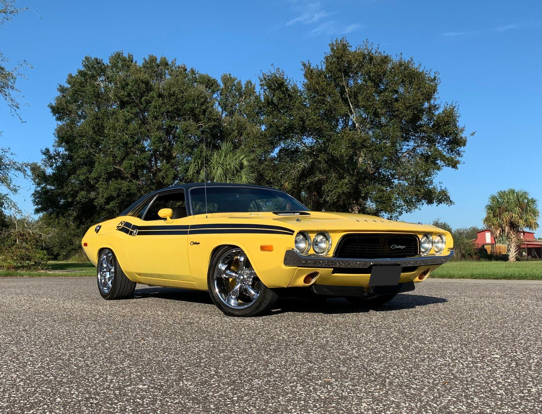 We are pleased to offer this 1973 Dodge Challenger for Sale. VIN matching 340 V8 engine block, Mopar aluminum intake, Edelbrock 4 barrel carburetor, headers, dual exhaust, automatic transmission, front power disc brakes, 8 3/4 rear end, front and rear sway bars, 18”/20” Coys C5 chrome plated wheels, beautiful yellow exterior, black vinyl top, black stripe package, Rally Hood, rear deck spoiler, black bucket seat interior, center console with floor shifter, iEquus Gauge package. With a tenacious sounding 340 V8 and a slick yellow-on-black color scheme, this Super Cool Mopar has that aggressive Pro-Touring look that everyone wants! This Challenger is a ton of fun and an eye catcher everywhere it goes! Call us today for the details before it's gone!